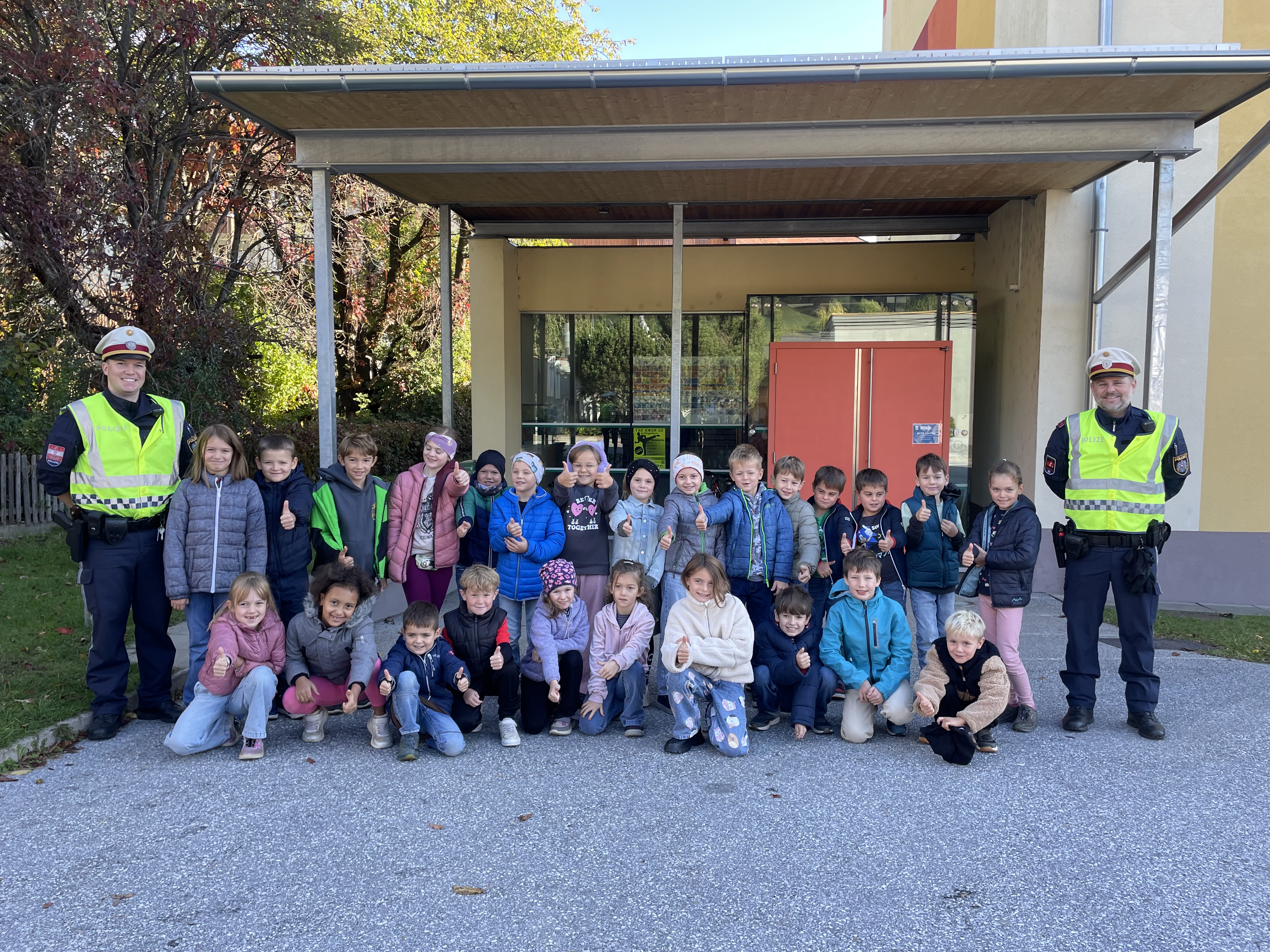 Zu Schulstart besuchte uns die Polizei und informierte alle Kinder der Schule über wichtige Themen rund um Sicherheit und richtiges Verhalten im Straßenverkehr. Im Anschluss durften die Kinder der 1. und 2. Klassen das Gelernte gleich in der Praxis anwenden: gemeinsam mit den Polizisten übten sie das sichere Überqueren der Straße und das richtige Verhalten an der Bushaltestelle. Die Kinder waren mit großem Eifer dabei und lernten viele wertvolle Dinge für ihren Schulweg.