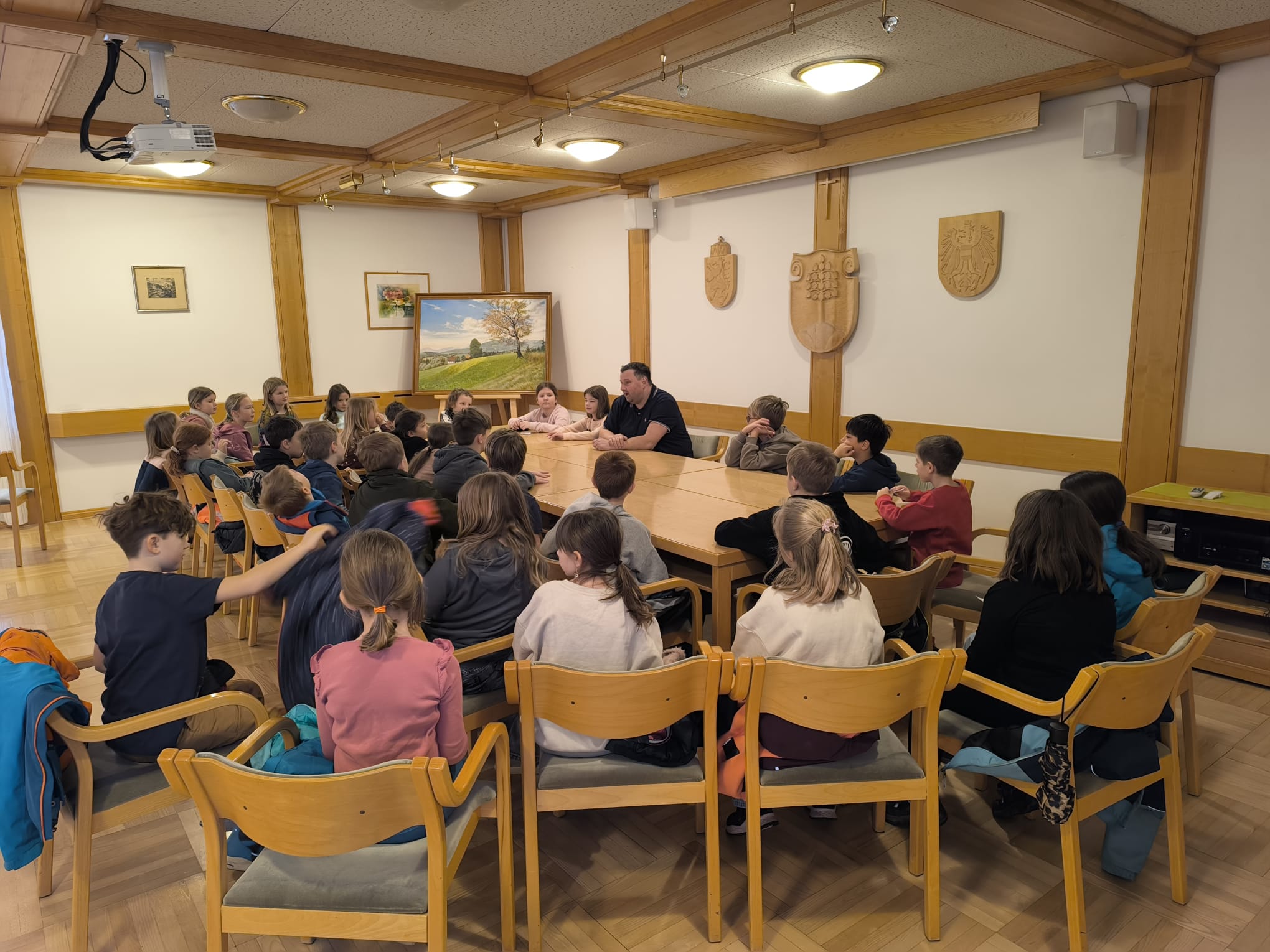 Die Schüler:innen der 3. Klassen besuchten im Rahmen eines Lehrausgangs den Bürgermeister Hannes Grabner im Gemeindeamt. Dabei wurde viel erzählt, gefragt und beantwortet. Herr Grabner nahm sich Zeit, erklärte seine Aufgaben und gab spannende Einblicke in die Arbeit der Gemeinde.