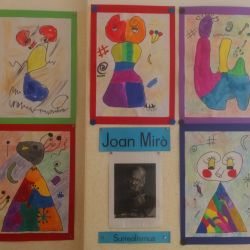 Im fächerübergreifenden Unterricht konnten die Schülerinnen und Schüler sich sowohl im Textilen Werken als auch im Bildnerischen Gestalten mit dem Künstler auseinandersetzten. Zunächst wurden im Unterricht des Bildnerischen Gestaltens typische Zeichen und Gestaltungselemente des Künstlers erforscht, ausprobiert und von den Kindern nach ihren eigenen kreativen Zugängen neu zusammengesetzt. Im Textilen Werken gestalteten die Kinder mit Fr. Rohrhofer ganz besonders kreative Joan Miró Karten mit Nadel und Garn. Auf der Rückseite der Karten wurden in Schönschrift die wichtigsten Fakten Mirós festgehalten. – Die Ergebnisse können sich sehen lassen!