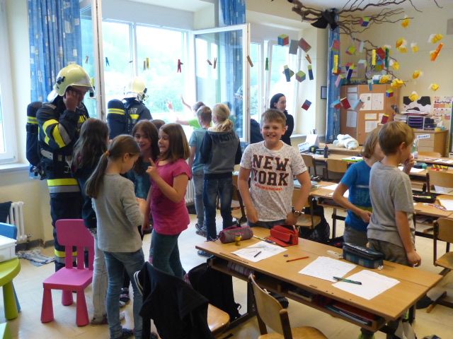 Anschließend begaben sich alle SchülerInnen und Lehrerinnen in den Turnsaal wo die Feuerwehrleute mit einem kräftigen Applaus empfangen wurden.