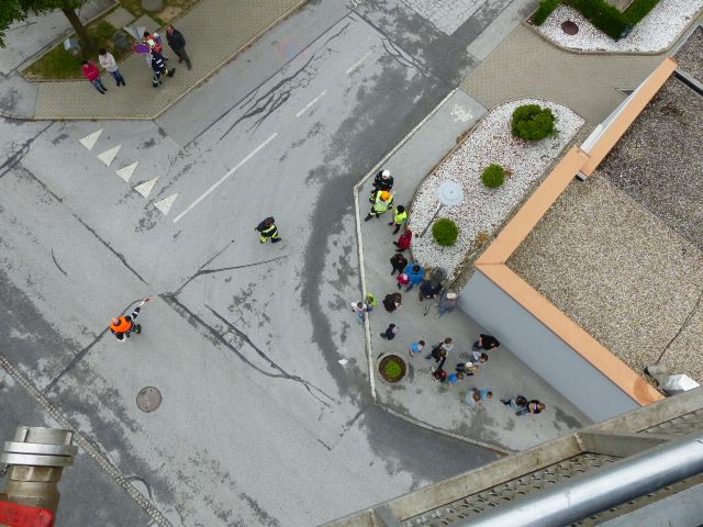 Am Sammelplatz hat Dir. Brigitte Gindra-Vady die Vollzähligkeit der SchülerInnen von sechs Klassen bei den einzelnen Lehrerinnen und das Fehlen der beiden Klassen aus dem 2.OG festgestellt. BSB Günter Kern konnte das Fehlen des Reinigungspersonals dem Einsatzleiter der Feuerwehr Anger mitteilen.