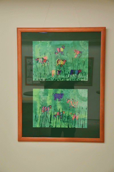 Zu sehen waren graphische Arbeiten, die Ausdauer, Genauigkeit und Feinmotorik der jungen Künstlerinnen und Künstler erkennen ließen. Bleistiftzeichnungen, monochrome Arbeiten, kolorierte Farb- und Filzstiftzeichnungen wie auch Acrylmalereien mit pastosem Farbauftrag und Malereien mit lasierendem Farbauftrag, mit höherem Wasseranteil, waren zu bestaunen. Es wurde nicht nur auf Papier gemalt, sondern auch auf Stoff. Neben den Gemälden entstanden auch fantasievolle Collagen. Ob Einzelarbeiten oder Gemeinschaftsbilder, die in Teamarbeit entstanden, der Fantasie der Kinder waren keine Grenzen gesetzt. So entstanden 3 D-Bilder aus Papier oder Stoff im BE- und Werk-Unterricht. Ebenso im Werkunterricht wurden Duftsäckchen in Form eines Kuhkopfes kreiert. Auch Tonskulpturen erfreuten das Auge des Betrachters. Eine Schaufensterpuppe wurde von den Kindern bekleidet und bietet eine modische Anregung für den modernen Mann. Die jungen Künstlerinnen und Künstler arbeiteten einige Wochen mit Begeisterung an der Fertigstellung der Arbeiten und wurden fachmännisch von den Lehrerinnen beraten, unterstützt und motiviert.