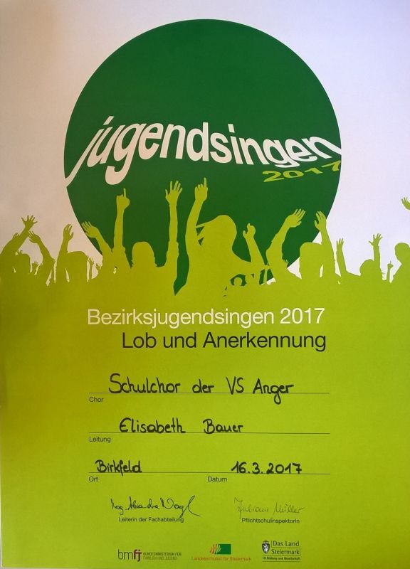Landesschulinspektor Dipl. Päd. Wolfgang Pojer, BEd mir der Chorleiterin Dipl. Päd Elisabeth Bauer, Dipl. Päd. Sonja Bäumel und dem Chor der VS Anger beim Bezirksjugendsingen 2017.